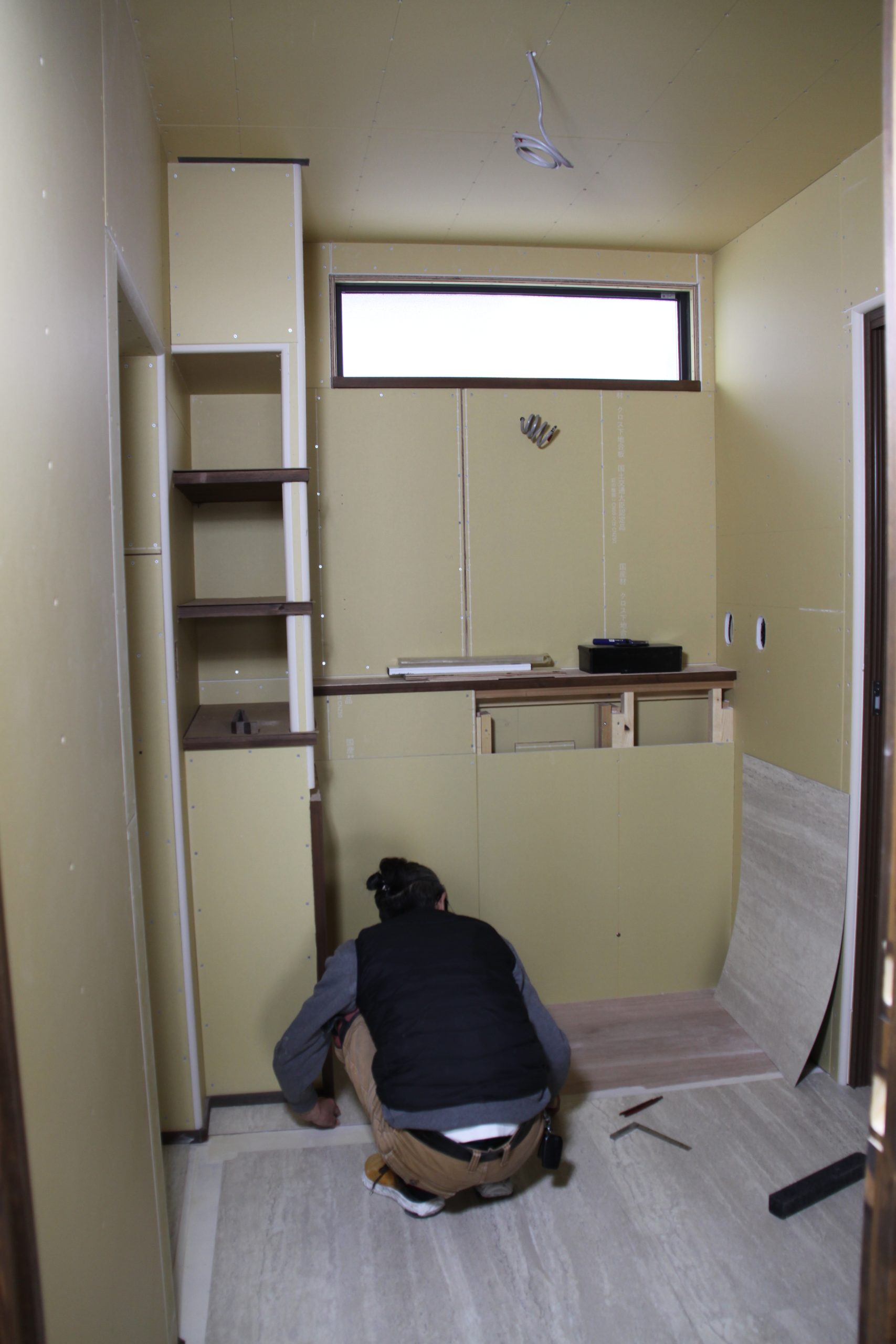 また洗面所では、職人さんのてによってフロアタイルの施工が進められ、日常の場所にも心地よさが重ねられていきます。