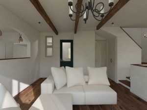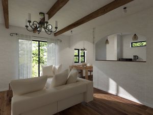 無垢の床や漆喰の壁、エイジングした梁、そしてアンティークランプが灯すやわらかな光。
