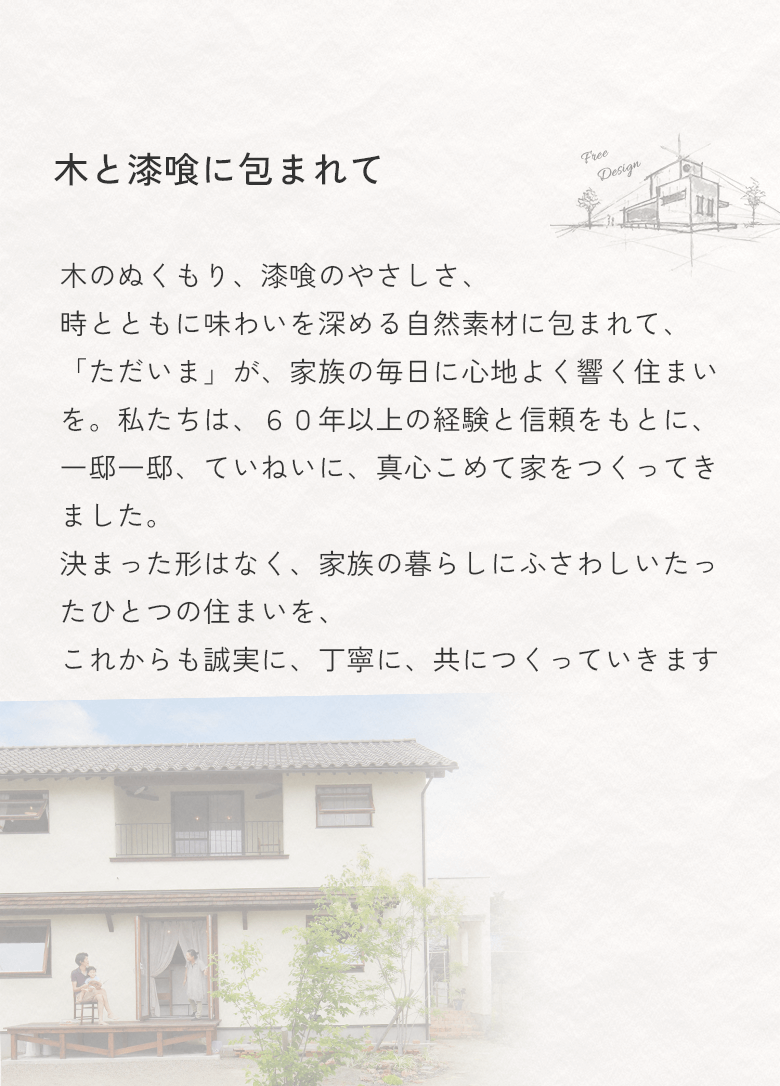 毎日を積み重ねていく大切な場所だから、自然素材でつくる優しい住まいを。天然木の香りに包まれる玄関、湿度を調整する塗り壁、素足がうれしい無垢材の床。身体に優しく、家族の健康を守りながら、季節を通して快適に暮らせます。化学物質を極力減らした安心設計で、お子さまの成長を見守り、大人は趣味を楽しむ。世界に一つ、家族だけのオーダーメイドの住まいです。