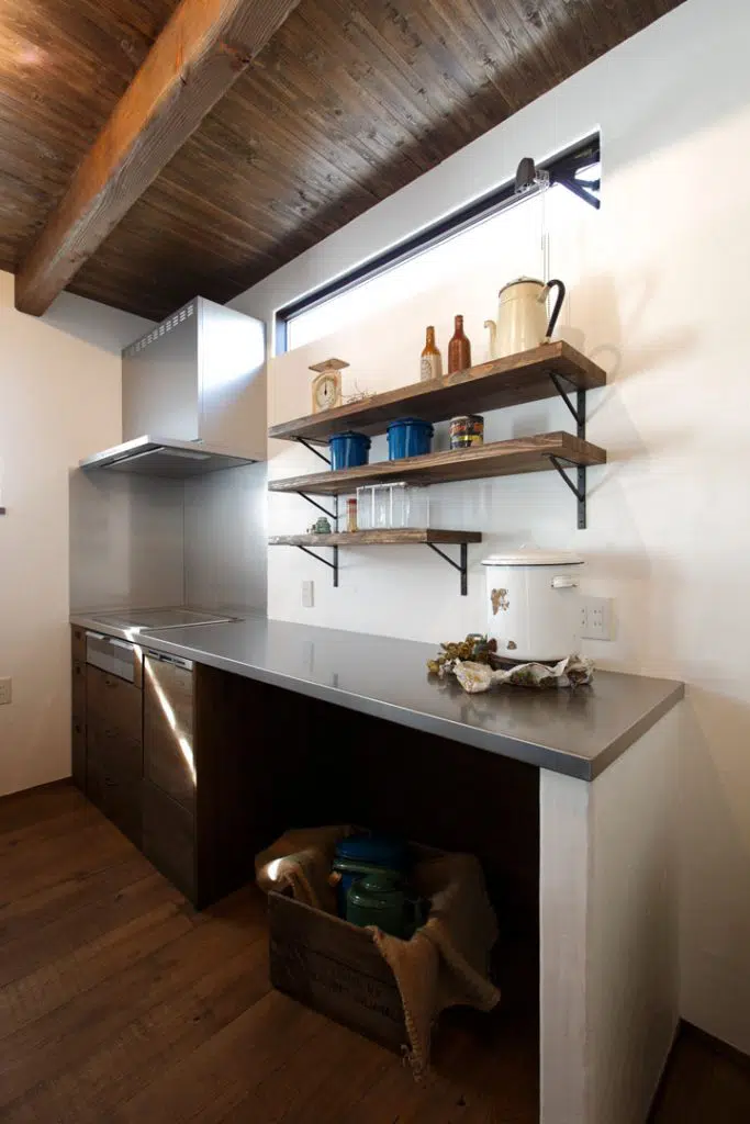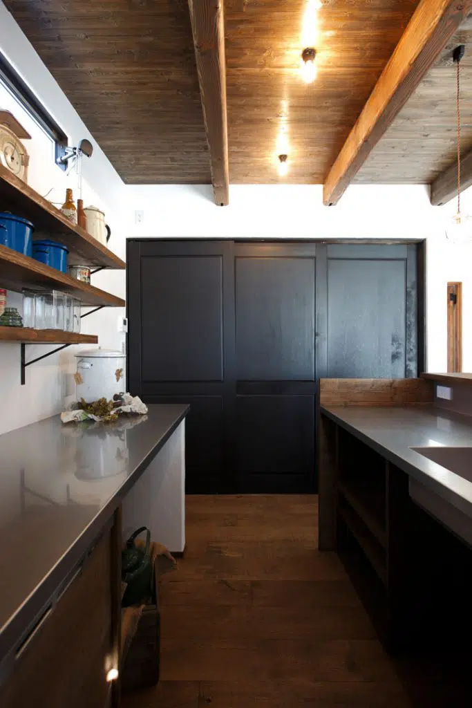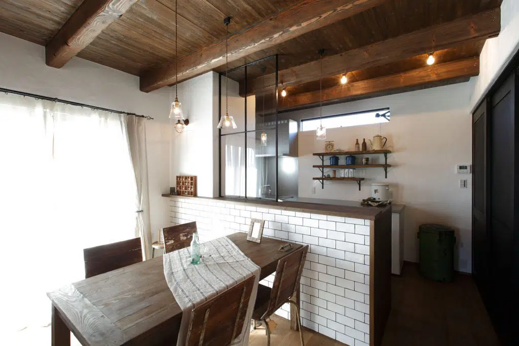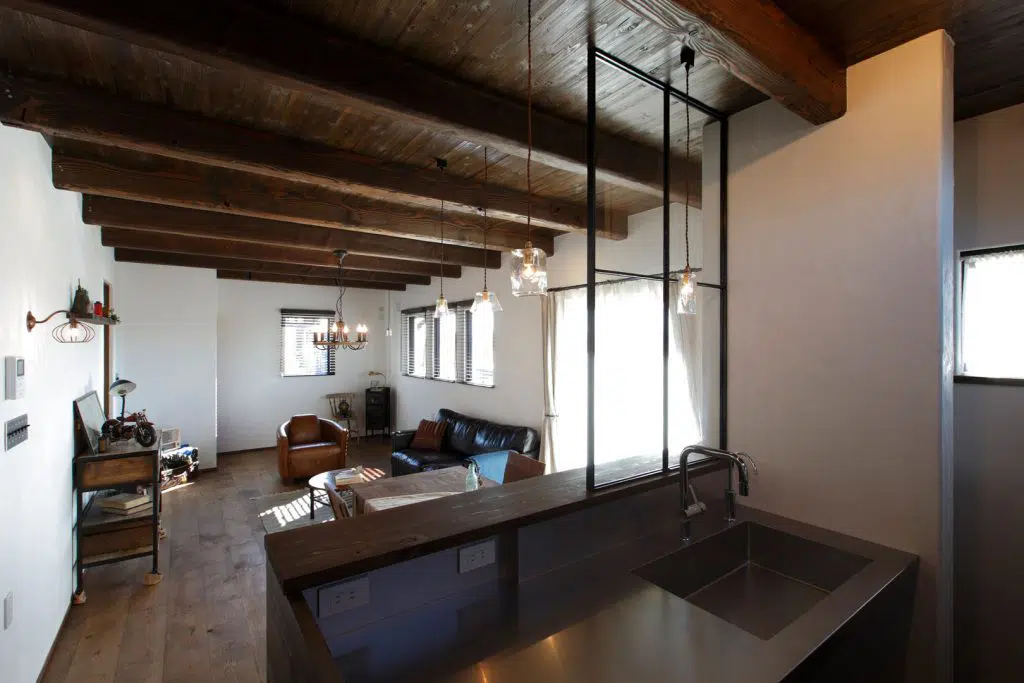 キッチンの鉄窓や扉のブラックで、木と漆喰の落ち着いた空間に男前感をプラス。